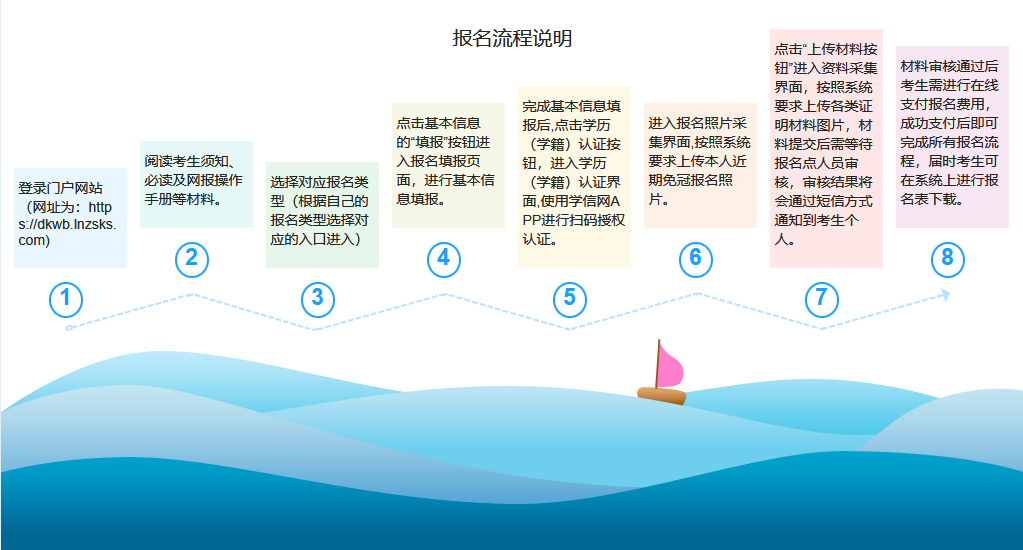 此次网上报名分为注册登录、填写基本信息、学历(学籍)认证、采集个人照片、报名资格审核、网上缴费等环节。