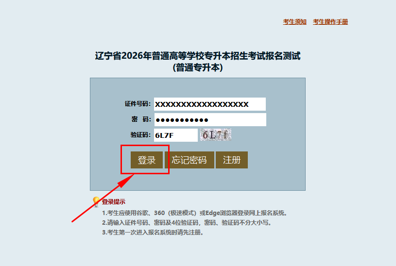 考生凭本人身份证号码、账号密码登录辽宁省普通高校专升本招生考试网上报名系统,注意:首次登录的考生需要完成注册并设置密码。考生应认真阅读了解报名、考试、录取政策和规定后,通过系统签署《考生诚信报考承诺书》等,并按要求上传所需报名材料。